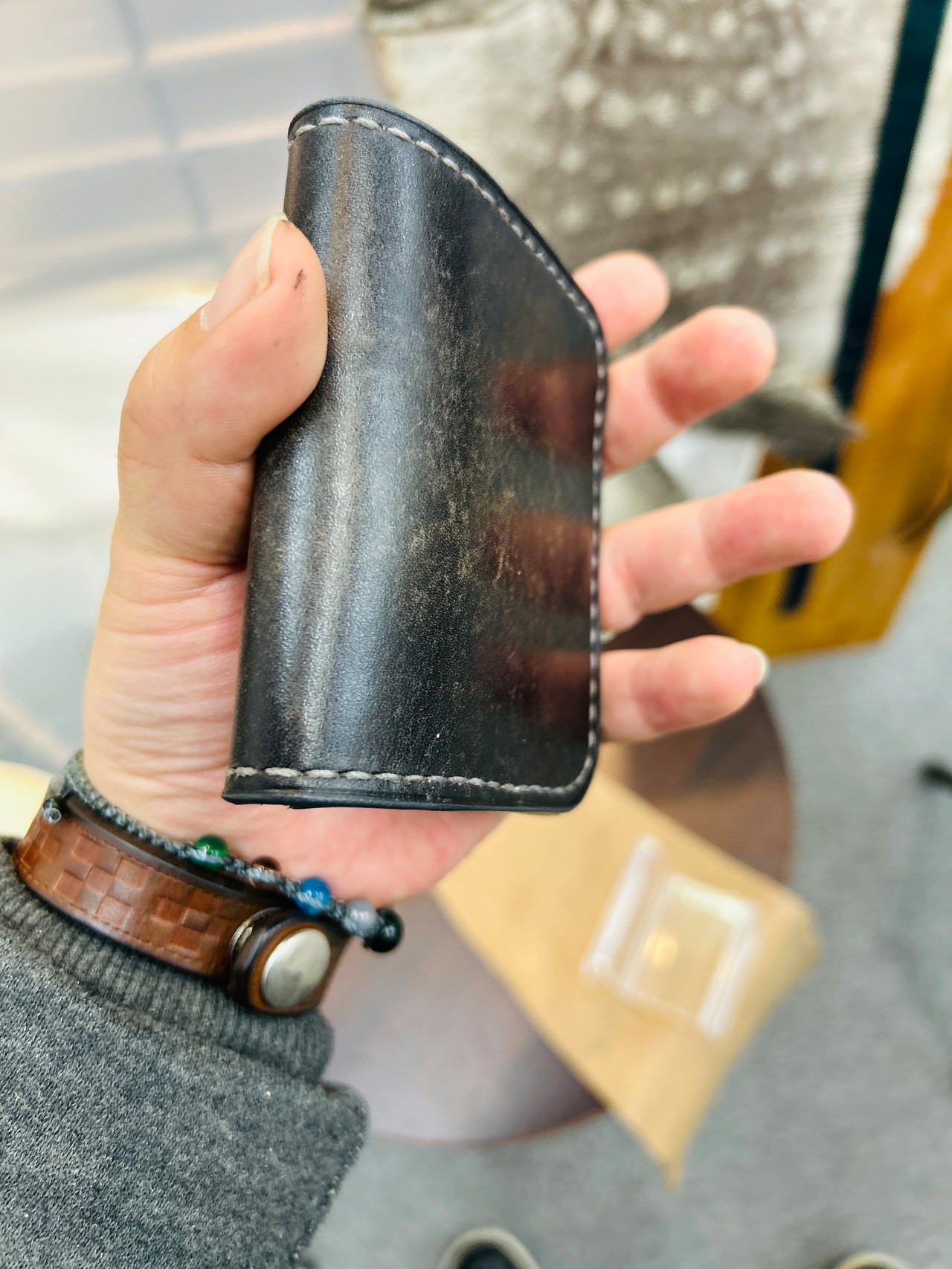 一枚の革を丹念に手染めし、仕上げた上質な艶が特徴的な一品です。